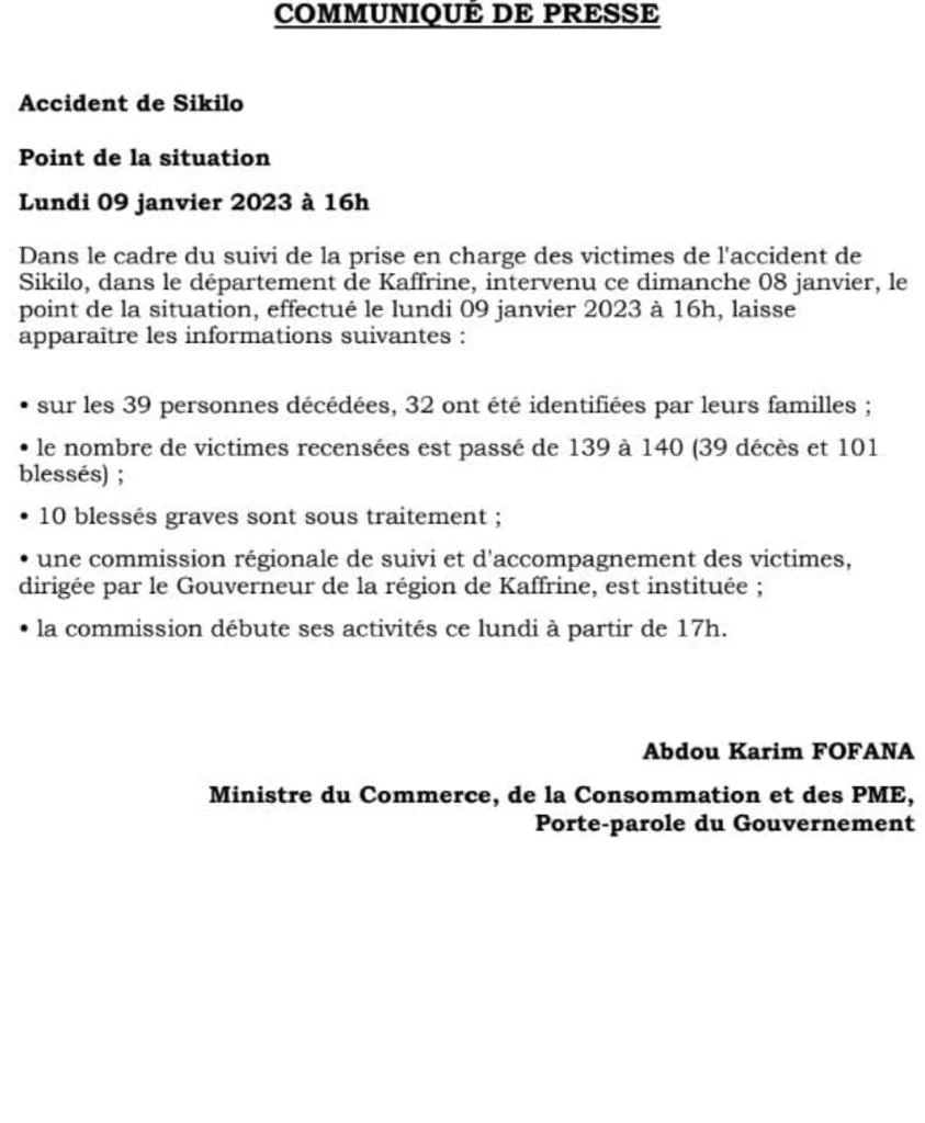 Communiqué: accident meurtrier au Sénégal survenu le 8 janvier 2023